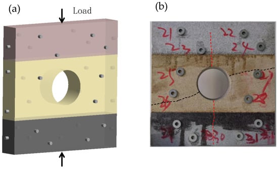 Here, we provide a case highlighting the algorithm’s application, based on an experiment on a simulated CCS with a hole in the laboratory. The sample used in the experiment was composed of three layers of rocks, namely, granodiorite, sandstone, and gabbro were assembled together to form a simulated CCS with the dimension of 298 mm × 300 mm × 48 mm (Figure 6). The thickness of the granodiorite, sandstone, and gabbro layer is 80 mm, 140 mm and 80 mm, respectively. A circular cavern with diameter of 83 mm was excavated in the center of the sandstone layer (Figure 6).