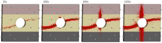 Cubic cell with side length of 1 mm was used to mesh the sample for computation. The adjacency radius was set as 7 times the cell size. Figure 7 shows the locations of the AE sources in four stages during the experiment. The results show that the AE events initiated along the pre-existing crack in the sandstone layer (subplot of 25 s in Figure 7). Then, the tensile cracks, which emerged at the top and bottom of the hole, gradually expanded through the granodiorite and gabbro layers, indicating that the confining hard rocks at the top and bottom cannot obviously hinder the propagation of the tensile cracks (subplots of 600 s, 840 s, and 1200 s in Figure 7).