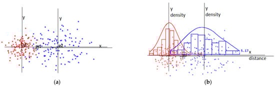 The constituent a is the j-th indication support that the i-th point is a true position, and it is a product of the density function as a diagram of the converted (X and Y) histograms, as well as a unary constant that defines the scope of the assumed neighbourhood. Constituent b is the mass of uncertainty that is imbedded in the j-th observation. The sum of both elements (a and b), as specified by Equation (8), must not be greater than one. A proportional reduction in the excess amount is suggested if necessary. The combination of all the assignments that involve a given point and all the observations provides a supporting measure that the location represents the true position of the observer.