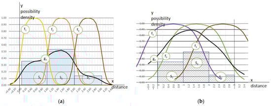 Figure 5). The wider the expansion of the MF, the greater and less differentiated the calculated total membership, and the higher the diagram height of the modified histogram (compare Histograms (a) and (b) of