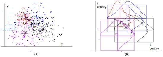 In Equation (8), C is a constant and is assumed to be equal to one, and it refers to the width of an area at approximately the i-th hypothesis point. Note that and are density functions: is the conditional dependency for the (attribute x in hypothesis object ) included in the evidence (j-th observation), and is the conditional dependency for the (attribute y in hypothesis object ) included in the oj evidence (j-th observation). is the uncertainty of the j-th two-dimensional piece of evidence.