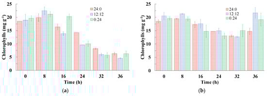 - Wahidin, S.; Idris, A.; Shaleh, S.R.M. The influence of light intensity and photoperiod on the growth and lipid content of microalgae Nannochloropsis sp. Bioresour. Technol. 2013, 129, 7–11. [Google Scholar] [CrossRef]