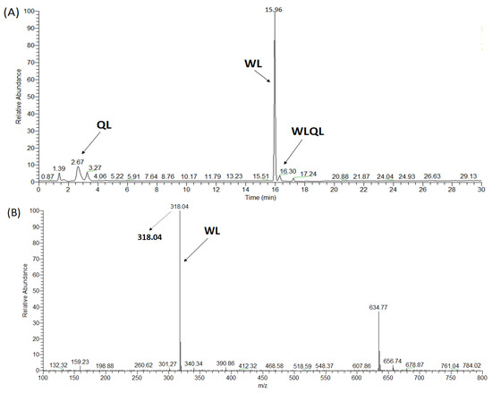 Liquid chromatography–mass spectrometry (LC-MS) profile of (A) WLQL full scan (m/z 559.30), (B) WL fragment (m/z 318.02); (C) QL fragment (m/z 259.99) derived from WLQL pre-incubated with ACE for 3 h at 37 °C.