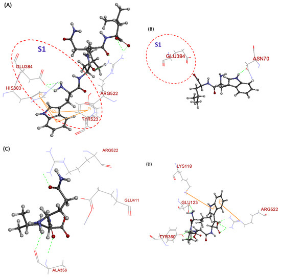 Moreover, the Arg522 residue that works as a notable ligand to the second Cl− of the ACE, the binding site for lisinopril, and the substrate of ACE, may enhance ACE inhibitory activity [26,44]. These molecules can interact with the enzyme through hydrogen bonding (H-bond), hydrophobic interactions, electrostatic forces, and van der Waals forces. Among them, H-bonds are considered as contributing elements to the structural stability of the ligand–receptor complex [8,45]. Two tetrapeptides WLQL and LPSW were selected for the docking simulation with tACE based on their high ACE inhibitory activity compared to the remaining peptides. Small fragments (WL and QL from WLQL; LP and SW from LPSW) obtained from pre-incubation with ACE were also used for molecular docking to clearly understand their role in enhancing the ACE inhibitory activity. As shown in Figure 4, all the obtained peptides could interact with the ACE receptor through the S1, and S2 pockets, and the other amino acid residues.