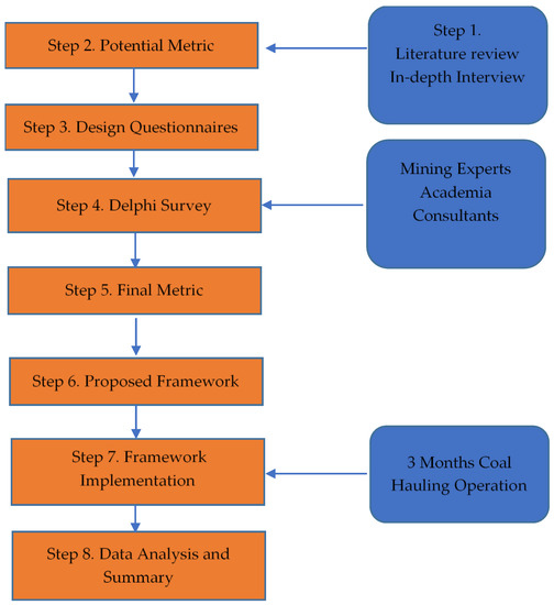 This research employed a mixed-method approach comprising both qualitative and quantitative methods. As a qualitative method to identify potential metrics, we employed in-depth interviews followed by three rounds of Delphi surveys. An in-depth interview is a qualitative research technique that involves individual interviews with a small number of respondents to explore their opinions on a particular idea [42]. The Delphi technique is a method for consensus-building using a series of questionnaires with multiple iterations to collect data from a selected panel [43]. The second method employed a quantitative method by testing the new metric in actual coal-hauling operations. The new metric was tested in an actual coal-hauling operation, and data were collected for three months to utilize the metric to measure and analyze the effectiveness of the coal transportation process. We proposed a methodology based on the approach in Figure 1. The main steps in our approach included identifying the potential metrics through a literature review and conducting an in-depth interview (step 1), obtaining the potential metric (step 2), designing the questionnaire (step 3), conducting the Delphi survey (step 4), obtaining the final metric (step 5), constructing the proposed framework (step 6), implementing the metrics in actual coal-hauling operation (step 7), analyzing the data and summarizing the result (step 8).