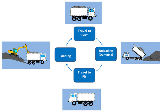 Once the driver returns to the loading point, they record the following data on the timesheet: time of entry and problems encountered during the hauling process cycle, including breakdown, refueling, stoppage, rain, slippery road, etc. The coal-hauling process is described in Figure 2. At the end of the working shift the driver completes and signs the timesheet, and submits it to the group leader, who confirms the document. If there is a difference, the group leader takes note of it and notifies the driver to verify the discrepancy. All data related to hauling operations are uploaded and stored in the mining control center (MCC). Operation data were collected for three months. For data reliability, we took the data from MCC that had already been verified by the operation control team.