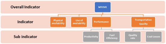 The proposed formula to calculate MTOVE is constructed as follows in Equation (1). To establish this formula, several metrics were combined: physical availability, use of availability, performance, and transportation quality. Physical availability represents the truck availability and use of availability represents the level of truck utilization, and performance represents truck productivity and the fuel consumption rate during the hauling process. Moreover, transportation quality represents transportation quality rate and coal loss during the hauling process. Safety, which is a crucial factor in mining, was also included in the quality rate calculation, which is the ability of the truck driver to operate without accident during the hauling process.