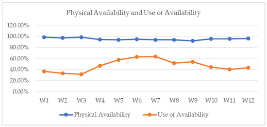 The average rates of physical availability and use of availability (UA) are described in Figure 4. The PA average value over a three-month period was 95%. This indicated that the trucks were in good condition since the total down-time was only 5% for all trucks. These PA values were still above the OEE availability benchmark value of 90% [28]. This was an achievement owing to the implementation of a basic total productive maintenance (TPM) program. However, the average rate of use availability indicated that the UA average value for the three-month period was 47%. The lowest UA was found in the first three weeks. Losses in these weeks occurred because of rain, which was an external factor and uncontrollable. However, from the fourth to the seventh week, the UA value increased because of less idle time as weather conditions were much better than in the first three weeks. UA increased because of less idle time, thus increasing operation time, which meant more time for hauling operations and higher truck utilization. The UA results indicated that the greatest loss of time was due to the idle time of the trucks. After further in-depth analysis, we detected that most of the idle time was attributed to rain and slippery roads, since the hauling road was built from original soil that does not resist water during the rainy season. Some of the losses were also due to the absence of a driver, idling the truck. Most of the time, trucks became idle because of weather conditions.