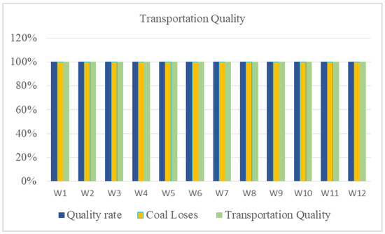 The average rate of transportation quality as a combination of quality of service and coal losses is described in Figure 6. The average transportation quality rate was 100%, which was still above the OEE quality benchmark of 99.9% [28]. This indicated that the company was still able to achieve service quality and minimum coal losses. The quality of service and coal loss factors were very close to the desired value. Both values during the three-month periods were 100%, supported by several trip failures and zero accidents. Zero trip failures due to a major breakdown indicated that truck maintenance activities were well performed after the company implemented total productive maintenance practices. Zero accidents also indicated that the safety performance was good, since the control and safety monitoring are very tight in mining operations.