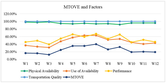 This section describes how MTOVE is applied and measured. The research results are based on the actual case study in a coal-hauling operation utilizing a 12-truck fleet, then the data were collected from the process to be analyzed. The time spent on the data collection was three months. The MTOVE metric for the truck fleet was calculated on a daily basis and each factor was studied separately. Each factor was calculated with the equations in Section 4.3. Figure 4 shows the average rate of all factors per week for the 12-week period for all unit trucks.