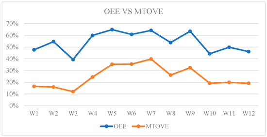 Figure 8 represents the comparison between the OEE and MTOVE over the three-month operation period. It shows the weekly average OEE calculation (availability performance quality) versus MTOVE (physical availability use of availability performance transportation quality) for three months. The graph illustrates that the weekly average OEE value was much higher than the MTOVE value obtained. Specifically, there were contrasting values for OEE and MTOVE; OEE obtained an average value of 54% and MTOVE obtained an average value of 25%. This happened because MTOVE accommodated truck utilization, which has a large impact on overall effectiveness results. However, the original OEE does not consider truck utilization. This UA was one of the factors that distinguished between the original OEE and the MTOVE concept.