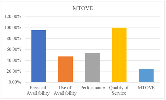 Second- and third-round questionnaires were prepared based on input from the first round, including a newly proposed metric; these enabled respondents to give their opinion about the newly proposed metric. This new metric was constructed based on the existing OEE approach. The basis for this grouping was the well-known, existing OEE metric; a researcher proposed the new metric MTOVE. MTOVE was constructed based on combining the elements of physical availability, use of availability, performance, and quality (see Equation (1)). The grouping of the proposed MTOVE metrics is described in Figure 3. As in the first round, the second- and third-round questionnaires were sent to the group of panel members by email. In the second and third rounds of Delphi, respondents were asked to give their opinion about the importance of the six selected potential metrics in the previous round. Respondents were asked to give scores based on a 5-point Likert scale. In addition, there were questions to determine respondents’ opinions on the new overall metric to measure overall transportation effectiveness by combining all metrics (MTOVE) based on a 5-point Likert scale. This purpose was to validate the proposed MTOVE.