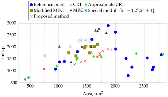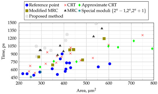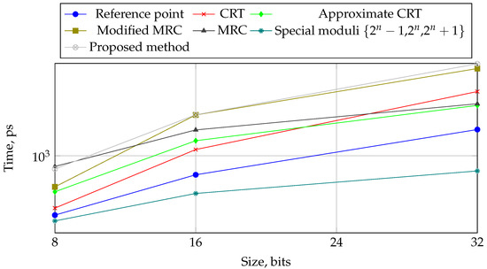 In the 16-bit domain (Figure 5), the method using special moduli has a clear advantage, and the method based on reference points has a low execution time, but at the same time significant hardware costs. The proposed method allows to reduce the used area, but slightly increases the computation time.