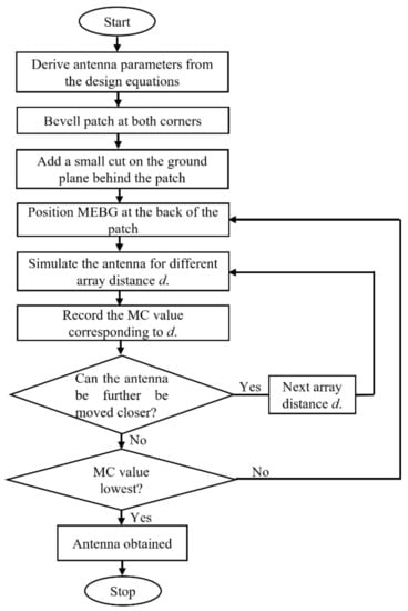 Figure 2 shows the flow chart of the proposed mutual coupling reduction for the UWB MIMO antenna. Based on the geometrical structure in Figure 1, the antenna parameters are obtained using a set of design equations. Patches are beveled at both corners of the antenna to enhance the impedance bandwidth. In addition, a small cut is provided on the ground plane of the antenna behind the patch to achieve impedance matching. Thereafter, two MEBGs are placed at the back of the patch in symmetrical order to optimize the performance of the antenna. The antenna array elements are separated by a far-field distance d. The value of d was varied, and corresponding mutual coupling values were observed for each distance. The far-field distance is varied until a satisfactory (lowest) MC value was obtained.