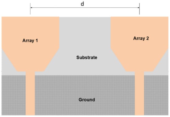 Figure 4 presents the layout of the UWB MIMO antenna created with HFSSv15 software. Two UWB monopole antenna elements were joined to form the antenna. The initial patch antenna structure’s dimensions were selected to achieve a resonance frequency of 6.85 GHz, which corresponds to the UWB’s center frequency. The maximum allowable distance d between the MIMO antenna elements could be derived from the far-field expressions illustrated in Equations (11) and (12).