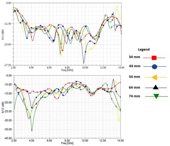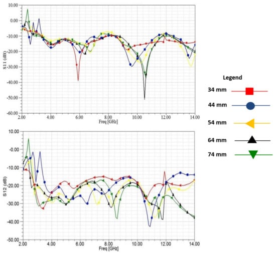 where f denotes the resonant frequency, λ is the wavelength, and D represents the antenna’s diagonal. At any distance above the far field, the MC in any MIMO antenna is at its minimum value. Due to the space constraints in UWB antenna design, the arrays are placed close together. Figure 5 illustrates the S-parameter of the MIMO antenna system without the MEBG decoupling structure. This demonstrates that for various values of distance d less than far field, the MIMO antenna has an impedance bandwidth smaller than −10 dB within the UWB frequency band. At a far field distance equal to some certain fraction λ, the S-parameter (S11 and S12) without decoupling structure is presented in Figure 5. This figure shows the variability of the S-parameter with the far field distances. Table 2 supplements the figure by showing the average MC effect when the decoupling structure has not been introduced into the array. As shown in Table 3, an increase in far field distance drastically improves the MC. Of course, this indicates the effect of increasing the separation between the array elements. In a closely packed array, the MC effect is more pronounced.