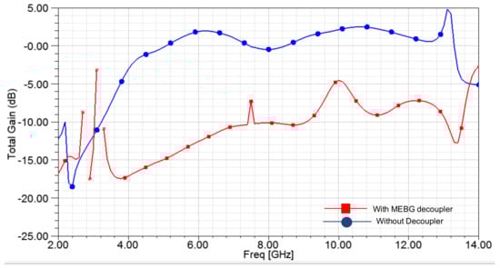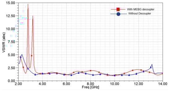 Figure 8 shows the array gain at a 44 mm far-field distance with and without the decoupling structure. When compared to an array without a decoupling structure, the MIMO antenna’s average gain has increased by 12 dB as a result of the MIMO structure and the decoupling structure. In Figure 9, the VSWR of the antenna with and without MEBG structure is presented. As can be observed, the VSWR is less than 2.0 within the frequency band for both scenarios. This indicates that there has not been a major change in the VSWR of the antenna since the decoupling structure was introduced, and thus the performance is not degraded.
