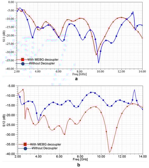 where S11 denotes the power reflected from the input port of the antenna, S12 is the power transmitted from the output port, S21 is the power transmitted from the input port, and S22 denotes the power reflected from the output port. To assess the impact of the decoupling method on the performance of the antenna, an analysis was also carried out for the antenna before the MEBG decoupling structure was introduced. The antenna design was carried out using HFSS modeling tools on a dual-core computing system.