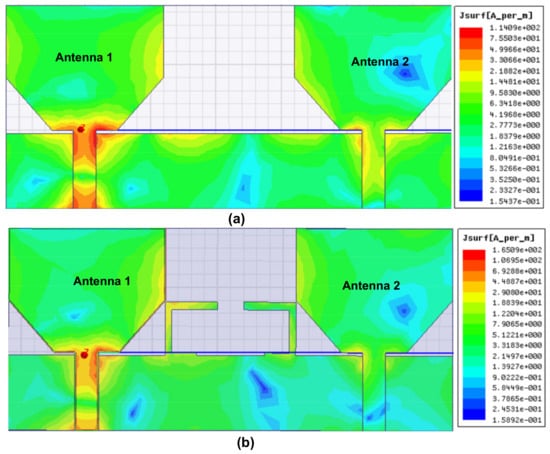 The surface current distribution with and without the inclusion of the decoupling structure is depicted in Figure 11. The current distribution between the array elements when one antenna is energized, and the other antenna is terminated by matching impedance was examined for both situations. From Figure 11a, a strong coupling could be observed between the arrays on the common ground plane that propagates to the non-energized antenna 2 on the right-hand side. The surface current density (J−surface) in antenna 2 revealed the undesirable coupling induced by excited antenna 1. To illustrate the effects of the MEBG structure, the antenna was then simulated at the same frequency of 6.85 GHz (Figure 11b). With the MEBG decoupling, it is evident that very little surface current density is flowing towards antenna 2. The MEBG has successfully prevented a substantial portion of the current that would otherwise propagate undesirably to antenna 2. MEBG, therefore, could considerably improve the isolation of MIMO antenna systems.