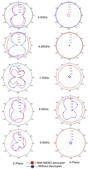 Figure 12 presents the E-field and H-field patterns of the UWB antenna array obtained at 4.5, 6.85, 7.5, 8.5, and 9.5 GHz, respectively. At lower frequencies, the E-field pattern with MC structure has 8-shape patterns with little variation at the higher frequencies. The E-field pattern without the decoupling structure does not have a regular shape. Looking at the H-field pattern, with the introduction of the MBEG decoupling structure, an omni-directional shape is observed for all the frequencies considered. A different pattern is observed when the decoupling structure was not introduced. At lower frequencies, the H-field tends to a point and exhibits an “8” shape only at 8.5 GHz.