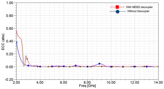 The diversity performance is based on the ECC. The ECC performance of the antenna with and without the decoupling structure is shown in Figure 13. With the MEBG structure, the antenna has an ECC value of less than 0.09 for the UWB frequency between 3.1 and 13.5 GHz. Without the decoupling structure, a spike above the 0.09 ECC value was observed between these frequencies. For instance, a significant difference can be observed at 7 GHz and 9 GHz where the ECC has a value above 0.09. This shows that with the introduction of the MEBG structure, the effectiveness of the antenna was not degraded. This makes the antenna a good candidate for MIMO communication systems.