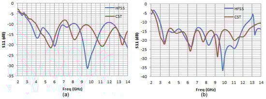 MIMO−UWB antenna S−parameter (S11) using HFSS and CST software (a) with MEBG, (b) without MEBG.