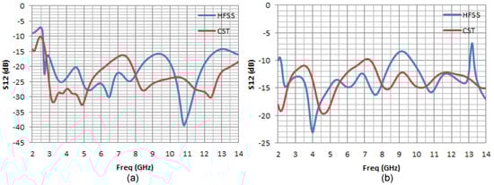 MIMO−UWB antenna S−parameter (S12) using HFSS and CST software (a) with MEBG, (b) without MEBG.