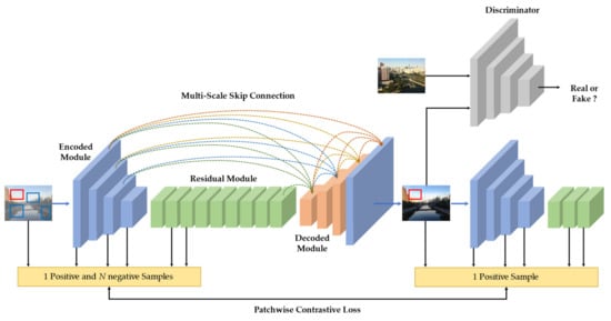 Contrastive learning has achieved great success in the field of unsupervised learning. In this paper, we determined the mapping function between haze and haze-free images by combining GAN and contrastive learning. As shown in Figure 1, the network structure proposed in this paper consists of a generator and a discriminator, where the generator consists of three parts: an encoding module, a residual module, and a decoding module. The feature fusion module based on the multi-scale skip connection proposed in this paper is used in the generator, aiming to recover the haze image into a clear and haze-free image, while the discriminator uses the now widely used PatchGAN [52], aiming to distinguish the generated clear and haze-free image from the original haze image. Given a haze image, we firstly adopted the encoding module to encode the input haze image into a low-resolution feature map, then used the residual module to extract more complex and deeper features from the low-resolution feature map and simultaneously remove the haze, and finally used the decoding module to output the final restored image, in which the residual module is essential because it not only extracts deeper features and improves the expression of characteristics, but it also stabilizes the training process by mitigating the problem of vanishing gradient and exploding gradient.