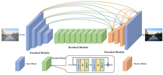 As shown in Figure 2, the input of the generator is a haze image, which is sequentially passed through the encoding module, the residual module, and the decoding module to obtain a clear and haze-free image. The encoding module consists of four convolution units, and each convolution unit consists of a convolutional layer, an Instance Normalization (IN) layer, and a ReLU activation function layer, in which the convolutional layer is a 3 × 3 convolutional layer with a step size of 2. The residual module consists of nine residual blocks, and each residual block includes a 3 × 3 convolutional layer with a step size of 1, an Instance Normalization layer, and a ReLU activation function layer. The decoding module consists of three deconvolution units and one convolution unit. Each deconvolution unit consists of a 3 × 3 deconvolution layer with a step size of 2, an instance normalization layer, and a ReLU activation function layer. The encoding module performs feature extraction on the input haze image, the residual module converts the extracted features into features that match the data distribution of the haze-free image, and the decoding module expands the converted features and inverts them to obtain the haze-free image.