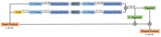 Firstly, the channel attention module is introduced in detail. The usual channel attention module uses global average pooling to map the feature map of each channel to a single value. However, this operation is not applicable for recovery tasks with high image detail requirements, and it tends to ignore the detailed features of images. Therefore, this paper combines image features with channel attention, such that the channel attention module focuses on global features, as well as local detail features of the image. As shown in Figure 3, the local context is combined with the global context inside the channel attention module. In the local context branch, it successively goes through 1 × 1 convolution, instance normalization, the ReLU activation function, 1 × 1 convolution, and instance normalization. In the global context branch, it successively goes through a global average pooling, then 1 × 1 convolution, instance normalization, the ReLU activation function, 1 × 1 convolution, and instance normalization. It is worth noting that 1 × 1 convolution preserves the size of the input features, which can preserve and highlight the fine details in the lower-level features. The tensor obtained from the local context branch and the global context branch is summed and then passed through a Sigmoid function to obtain a tensor with values in the range [0, 1], and this tensor is combined with the input tensor passed through a (1-Sigmoid) function to obtain the final output. The formulae are shown below