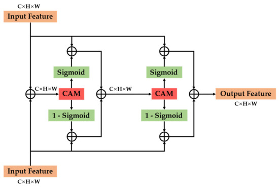 Based on the channel attention module described above, the feature fusion module is shown in Figure 4. The two input features are first summed and then passed through the channel attention module to obtain the features after importance selection by the channel attention module, which are then multiplied by the two input features after the Sigmoid function and (1-Sigmoid) function, making it possible to adaptively adjust the proportion of the two input features in the fused features. To deepen the depth of feature fusion, the output features obtained are then repeated in the above process to fuse features of different semantics and different scales more deeply.