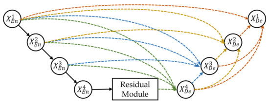 As shown in Figure 5, an overview of the multi-scale skip connection based on a residual network is given. Each layer of the decoding module contains small-scale and same-scale feature maps from the encoding module and large-scale feature maps from the decoding module, resulting in the multi-scale capture of low-level detail features and high-level semantic features.