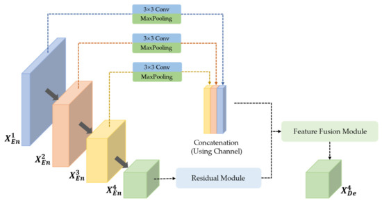 As shown in Figure 6, the feature map of how to construct the fourth layer in the decoding module is given. For a layer in the decoding module, the feature maps from the same scale of the encoding module, the feature maps from the smaller scale of the encoding module after the maximum pooling operation, and the feature maps from the larger scale of the decoding module after the bilinear interpolation operation are stitched together by the channel dimension while reducing the redundant information, and they then are inputted to the feature fusion module simultaneously with the output from the previous layer. The fused feature map is finally obtained.