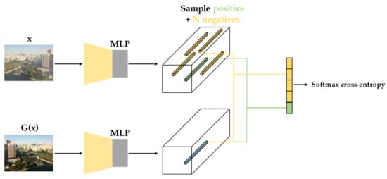 The main idea of contrastive loss is to make the positive samples closer to each other while making the negative samples further apart. For an image patch in the generated image, we call it a query sample and find the corresponding image patch in the original image; these two image patches are called positive samples, while the image patch in the generated image and other image patches in the original image are called negative samples. Specifically, we picked a query sample and found its corresponding patch in the original image as a positive sample , and then found N negative samples and mapped them to K-dimensional vectors, where , , and ; then, we built an (N+ 1)-way classification problem using cross-entropy loss to compute the probability of selecting the positive sample over negative samples, with the following equation: