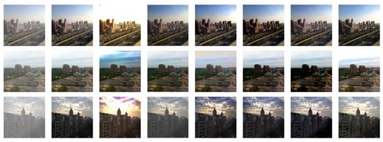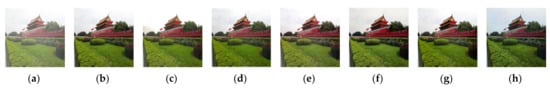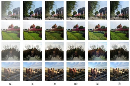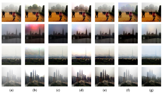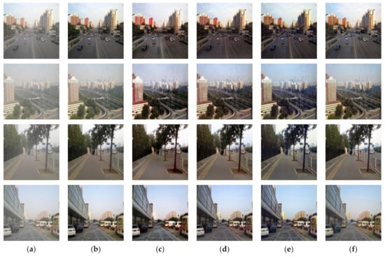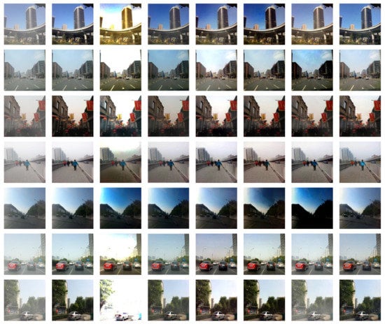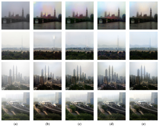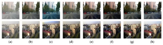In this paper, the algorithm was built based on the PyTorch framework, the experimental platform was the Ubuntu 18.04 operating system, and the graphics card was ab NVIDIA GeForce RTX2080Ti. In the training process, the input image was always set to 256 × 256, and the network was optimized using the Adam optimizer. The initial learning rate of the network was 0.0002, the total number of iterations was 200, the learning rate of the first 100 iterations was unchanged, and the learning rate of the last 100 iterations decreased linearly to 0. The value of the weight coefficient in the loss function was chosen to be unchanged from the default value of 10 in CycleGAN. Meanwhile, after experiments, the best results were obtained when and were selected to be 1 and 0.5, respectively. The parameter settings of the other dehazing algorithms were kept the same as those in the original papers.