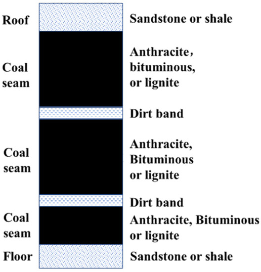 In general, occurrence conditions of coal rock seams are composed of whole coal and whole rock (through the fault) as well as coal and rock mixtures (coal and roof, coal and floor, coal and gangue, coal and inclusions) [9]. The roof and floor strata are located above and below the coal seam, respectively; complex coal seams show at least 1–2 layers of stable gangue strata, and several layers at most (Figure 2) [10]. In China, there are lots of coal bases and mining areas which exhibit distinct geological occurrence conditions of coal seams as shown in Table 1. According to coal seam thickness, the coal seam can be divided into thin coal seam (<1.3 m), medium thick coal seam (1.3–3.5 m) and thick coal seam (>3.5 m). According to the standard GB/T 18023-2000 in China, the coal is macroscopically divided into bright coal (vitreous and bright coal > 80% and presence of metallic or metal-like luster), semi-bright coal (vitreous and bright coal 50–80% and presence of glass luster), semi-dark coal (vitreous and bright coal 20–50% and presence of dull luster) and dull coal (vitreous and bright coal < 20% and presence of silk luster). However, there are lots of classification methods of coal lithotype according to different criteria (Table 2). Li et al. [11] revealed that hard dirt bands are mostly distributed about 0.34 m away from the roof with a thickness of 0~0.4 m, of which 71% exhibits the thickness of 0~0.2 m and 21% presents the thickness of 0.2~0.4 m. They are distributed unevenly in layers. Generally, areas with hard dirt bands smaller than 0.2 m can be directly mined by the improved powerful drum-reinforced pick shearer. Areas with hard dirt bands thicker than 0.2 m need to be blasted. Krivosheev and Koval [12] employed the instrument for recording acoustic signals on tape and their subsequent analysis, to obtain a “map” of seam inclusions. Ordin et al. [13] developed the model of a coal seam with distributed geological and geomechanical characteristics using inverse distance weighting, and found the hyperbolic dependences of the drum shearer advance speed and capacity on the coal seam thickness.