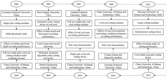 Different mechanical coal-rock breakage equipment presents distinct pick types, layout modes and output powers. Bakhtavar [46] determined the optimum drum shearer for Tabas mine using decision making process. Ivanov and Ivanova [47] thought that variations in the level of seismo-acoustic activity of the seam reflected variations in the state of stress of the seam close to the face. From the comparison of the mechanical coal-rock breakage methods of Hob, diamond core drilling, drag bit and impact grinding [48], it is clearly seen that the impact grinding method exhibits good coal-rock breakage properties. As the drum shearer pick directly acts on the coal-rock, it presents a small contact deformation area at first, then the crack initiation at the stress concentration region below the pick occurs, afterwards the unstable crack propagation of the main crack, and finally the formation of falling coal-rock debris [49,50]. In order to explore the mechanical coal-rock breakage mechanism, previous researchers have proposed theoretical cutting models [51,52,53,54] and finite element models. Meanwhile, discrete element models of pick cutting coal rock have been established to investigate the evolution of pick force versus cutting depth, chip formation at the leading edge of the pick, and crack initiation around the pick [55,56,57]. Besides, Balci et al. [58] have established the full-size single-pick coal-rock cutting machine at the Istanbul University. Bakar and Gertsch [59] have established the linear coal-rock cutting machine at the University of Missouri. Li [32] from China University of Mining and Technology have established the full-size single-pick coal-rock cutting machine. Detailed illustrations of progress on the pick cutting coal rock can be found in Table 3.