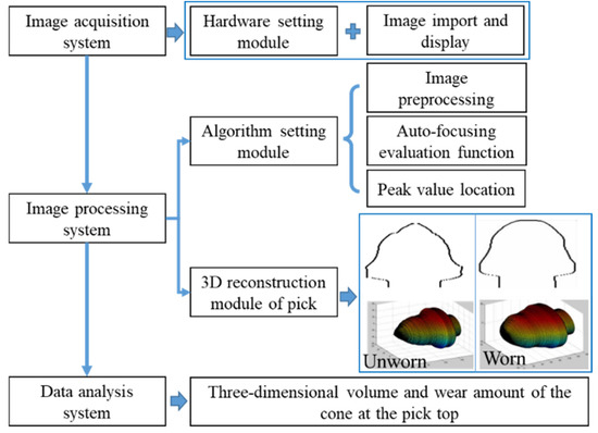The wear of the pick is important for estimating the downtime of the cutting machines [121]. The degree of pick wear greatly affects the cutting efficiency, energy consumption and service life of the shearer drum. Therefore, the quantitative evaluation of pick wear is of great theoretical significance to the determination of pick deterioration grade and prediction of pick service life. In general, pick wear is mainly measured through the weight loss method [183] and three-dimensional morphology recovery method [184,185]. Traditional three-dimensional morphology recovery technologies, i.e., the shape from shading method, stereovision method and structured light method, have limitations in obtaining accurate morphologies [185]. However, the focused morphology recovery technique has the advantages of non-occlusion, strong practicability, high accuracy and a simple algorithm, which can make up the limitations of traditional three-dimensional morphology recovery technologies. In order to obtain the three-dimensional morphology of pick cone and pick wear rate, the pick wear measurement system has been established combining the normal distribution operator filtering based on image processing method, improved focus evaluation function, focused morphology recovery method, and optimization design method. Figure 4 shows the pick wear measurement system based on the focused morphology recovery technique [16]. Kim et al. [186,187] investigated the effects of the skew angle of a pick cutter on its wear phenomenon using a frictional ignition test machine, and they reported the importance of the skew angle on the wear behavior of a pick cutter.