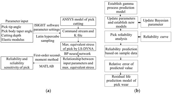Prediction flow charts of the reliability and residual life of the pick: (a) neural network and first-order second-moment method, and (b) gamma process and Bayes method.