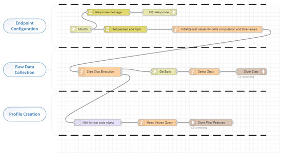 The application profiling system has two major components in order to work—the profiling component and the model trainer component. The profiling component is responsible for the creation of the multidimensional vector that represents the profile of the resource usage of a benchmark or application. As far as the profiling component is concerned, there are three main processes in the form of Node RED flows (as depicted in Figure 2) that are performed in order to create the profile, and these flows have the following functions.