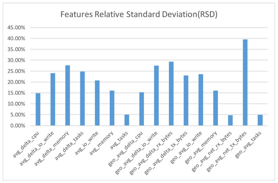 After the theoretical elimination process, a preliminary statistical analysis was conducted in order to identify the most stable features to represent the profile. The dataset used for this statistical analysis is the corresponding training dataset as shown later in the experimentation section, and the key performance indicator for the selection was the relative standard deviation (RSD). In order to compute the overall RSD for every feature, the RSD for every individual benchmark and workload combination is first calculated. Afterward, the mean value of all the different feature RSD is calculated. As depicted in Figure 4, 16 features with relatively small RSD were selected (most of them having RSD lower than 25%). Although the RSD for some of the features appeared to be high (i.e., geo_avg_net_tx_bytes, a metric describing the geometrical average bytes transited has RSD close to 40%) in reality it is adequate, given that the dataset contains data from three different hardware configurations. In addition, it is important to mention that some benchmarks have some features stable and another one with more significant deviation that affects the overall RSD. This does not raise any concerns because the used ML classification algorithm (random forest) discards features (binary trees) that do not aid the classification process. As depicted in Figure 4, features that concern the CPU and memory footprint of the average deltas produced the most promising results, because they represent the rate at which the application or benchmark request and use CPU and memory time, respectively. Lower deviations were found only in the task-(process threads) and network-based features, an expected outcome because there is a constant number of tasks and network packages that most of the benchmarks produce.