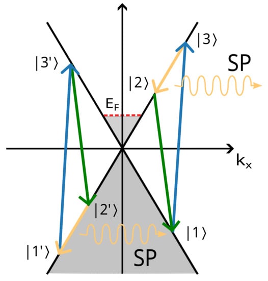 determines the SP dispersion relation [27]. We can see from Equations (13) and (14) that there is a transfer of energy between the two optical fields, which is mediated by the SP field formed in the vicinity of graphene and, therefore, is resonant under the condition (18). This process, in spite of being due to the second-order response of graphene, is, in fact, of the third-order in optical fields.