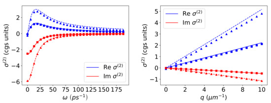 Figure 3 shows the behavior of the real and imaginary parts of as functions of and q, for two values of the Fermi energy. The results obtained by the analytical formula (8) are confirmed by direct numerical evaluation of Equation (6). In the left panel, for a fixed value of q, the real part of the conductivity peaks at , and the imaginary part becomes considerable for frequencies . An important feature of Equation (8) for the second-order conductivity is that it goes to zero as , as it should for a centrosymmetric material. This physically meaningful feature was lacking in the results of Refs. [8,23]. The reason for this probably is the problem with intraband matrix elements for the operator, first pointed out by Blount [26]. The analytical formula derived in Ref. [22], although showing the correct limiting behavior for , is somewhat different from ours and we were not able to reproduce it following the steps indicated in the supporting material of that article. Let us emphasize that the points in Figure 3 represent the results of direct numerical evaluation of Equation (6), performed without approximations such as expansions in terms of wavevectors, so we believe that these spectra are correct within the model and approach used. It is the imaginary part of the conductivity that is important to describe the SP generation process, so we have from Figure 3 a for ps. Even though it is larger than the value calculated in Ref. [22], it is below the experimentally estimated value [6] by some 3 orders of magnitude. We shall discuss the possible cause of this discrepancy in Section 3.