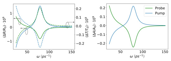 Differential reflectance (left, solid lines), transmittance (left, dashed lines), and absorbance (right) of the pump (blue curves) and probe (green curves) beams as functions of . Here the Fermi energy meV, , and , while other parameters are the same as in Figure 3. The plasmon resonance is observed at approximately . We assumed the same intensities for both optical beams, , in order to facilitate the comparison.