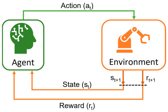 Independently of the sector, manufacturing comprises many processes, from planning and scheduling to executing physical operations in the production line until the product is ready for distribution [9]. Among these processes, there are tasks involving production scheduling, assembly, decision support systems and path planning. Currently, many of them are carried out by digital systems and robots thanks to the automation of factories, improving their efficiency [10]. However, applying artificial intelligence, in particular machine learning (ML), takes a step forward in this enhancement. Without being explicitly programmed, machine learning algorithms endow automatons with cognitive capabilities that allow them to learn a task [11]. However, the bulk of these algorithms require data in order to learn, and it is not always possible to obtain accurate data in some industrial settings. Reinforcement learning (RL) is a machine learning paradigm that is ideal since its algorithms immediately learn from interaction with the environment. Additionally, the use of deep neural networks (DNNs) with RL algorithms gave rise to deep reinforcement learning (DRL), whose algorithms are capable of learning more complex tasks [12]. Furthermore, those algorithms are relevant for both I4.0 and the upcoming I5.0 since they align with the objective of industry 5.0 easily adapting to a more human-centred approach [13,14].