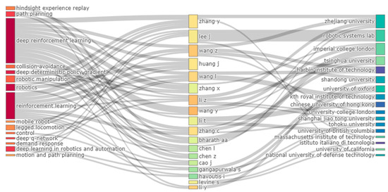 From the previous query, a total of 244 documents were returned (of which one was excluded due to it not staying within the topic), ranging in publication date from 2016 to 2023. From the initial period up to 2021, an annual growth rate of 133.22% was found, making this research topic very important to the field, as illustrated by Figure 2. Furthermore, from the entire range of publication dates, it was found that there is an international co-authorship of 25.1%. In addition to measuring the co-authorship, this indicator includes hidden relationships between the co-authors of a scientific paper, such as motivation and the research rank of their institutions [47]. This level of international co-authorship involves a high degree of international collaboration and a positive contribution to the citation impact [48]. As a result, there is a noteworthy flow of researchers between institutions in different parts of the world, enabling deep investigation of DRL applications in manufacturing. This is illustrated in Figure 3, where the most active researchers in the field are linked to the most relevant topics they have investigated and the research institutions they belong to. It can be noted that most of the researchers have belonged to several research institutions, showing the close collaboration between them, and they have participated in several scientific publications on different topics within this field. These collaborations allow progress in the development of new DRL technologies in the industry.