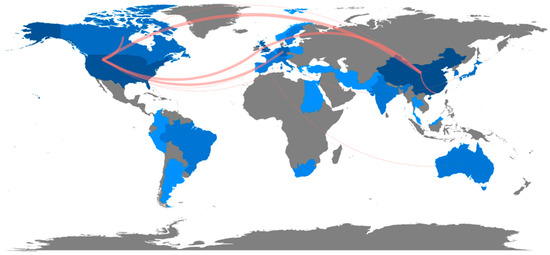 The institutions shown in Figure 2 are leading in deep reinforcement learning research. If this is translated geographically, it can be observed that most of them belong, in this order, to China, the United States and the United Kingdom. Figure 4 depicts the collaborations between institutions by country, where the strongest research relationships in this field emerge. The strong and stable relationship between American and Chinese institutions is noteworthy, with a flow of researchers in both directions. In fact, for China, the United States is the only country with which close collaboration is observed. However, the United States does have collaborations with institutions in European countries, such as Imperial College London and Oxford University from the United Kingdom and the Robotic Systems Lab belonging to ETH Zürich (Switzerland). Lastly, although not many active researchers from Canadian institutions have been detected, the analysis shows a large number of collaborations between those countries.