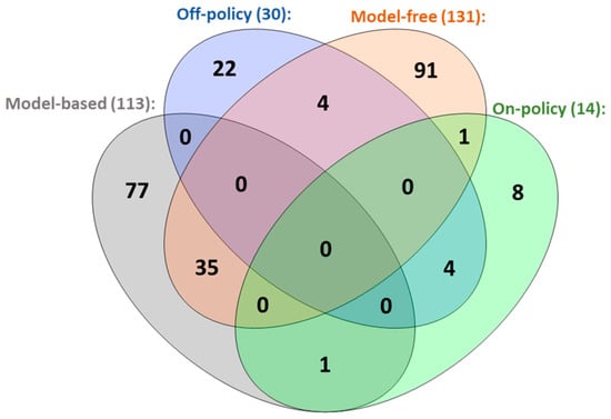 Regarding the appearance of the main approaches to DRL, of the 243 documents: 131 of them mention a model-free approach (53.91%), 113 model-based (46.50%), 30 off-policy (12.35%) and 14 on-policy (5.76%) approaches. Moreover, 35 documents mention both model-based and model-free approaches (14.40%); one mentions both model-based and on-policy approaches (0.41%); one mentions model-free and on-policy approaches; four mention model-free and off-policy approaches (1.65%); and four mention on-policy and off-policy approaches. Overall, it seems that the DRL applications in the industry are more focused on the need for a model of the environment, highlighting the vast presence of model-free and model-based approaches. Nonetheless, although any algorithm can be classified as on-policy and off-policy, this characteristic is not highlighted in the title, abstract or keywords of the scientific publications analysed. These data are illustrated in the form of a Venn diagram in Figure 6: