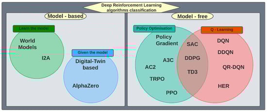 Lastly, it should be highlighted that these classifications are not exclusive, and there are algorithms that integrate features and techniques of different groups, such as the hybrid algorithms that are halfway between policy optimisation and Q-learning families (see Figure 9). Some algorithms of this group are Soft Actor-Critic (SAC) [92], Deep Deterministic Policy Gradient (DDPG) [93] and Twin Delayed Deep Deterministic Policy Gradient (TD3) [94]. These algorithms address some of the weaknesses of the other algorithms that allow the implementation of approaches to more complex problems. In addition, combinations of algorithms from different groups can be found in the literature, such as DDPG + HER [95] and model-free and model-based algorithms [61].