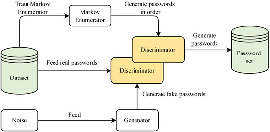 Regarding previous password generation research, [9,10,11], in this paper, we highlight and analyze the ordered Markov enumerator (OMEN) model [9] and the PassGAN model [11], which are password-generation methods based on traditional Markov chains and a generative adversarial network (GAN) [25], respectively. The starting point of the OMEN model is that high-probability passwords are ranked in front of the password set to accelerate password cracking.